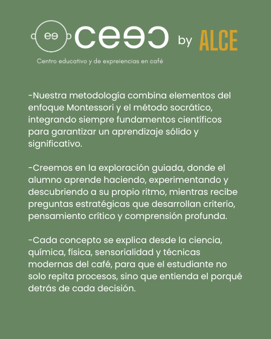 Como extensión de esta visión, presentamos CEEC — Centro Educativo y de Experiencias en Café, un espacio diseñado para explorar el café desde una perspectiva multisensorial y profundamente formativa. CEEC combina metodologías Montessori y socráticas, junto con un enfoque basado en ciencia, para ofrecer aprendizaje activo, práctico y significativo. Aquí, cada estación, cada ejercicio y cada taza se convierten en una experiencia que despierta curiosidad, pensamiento crítico y creatividad.